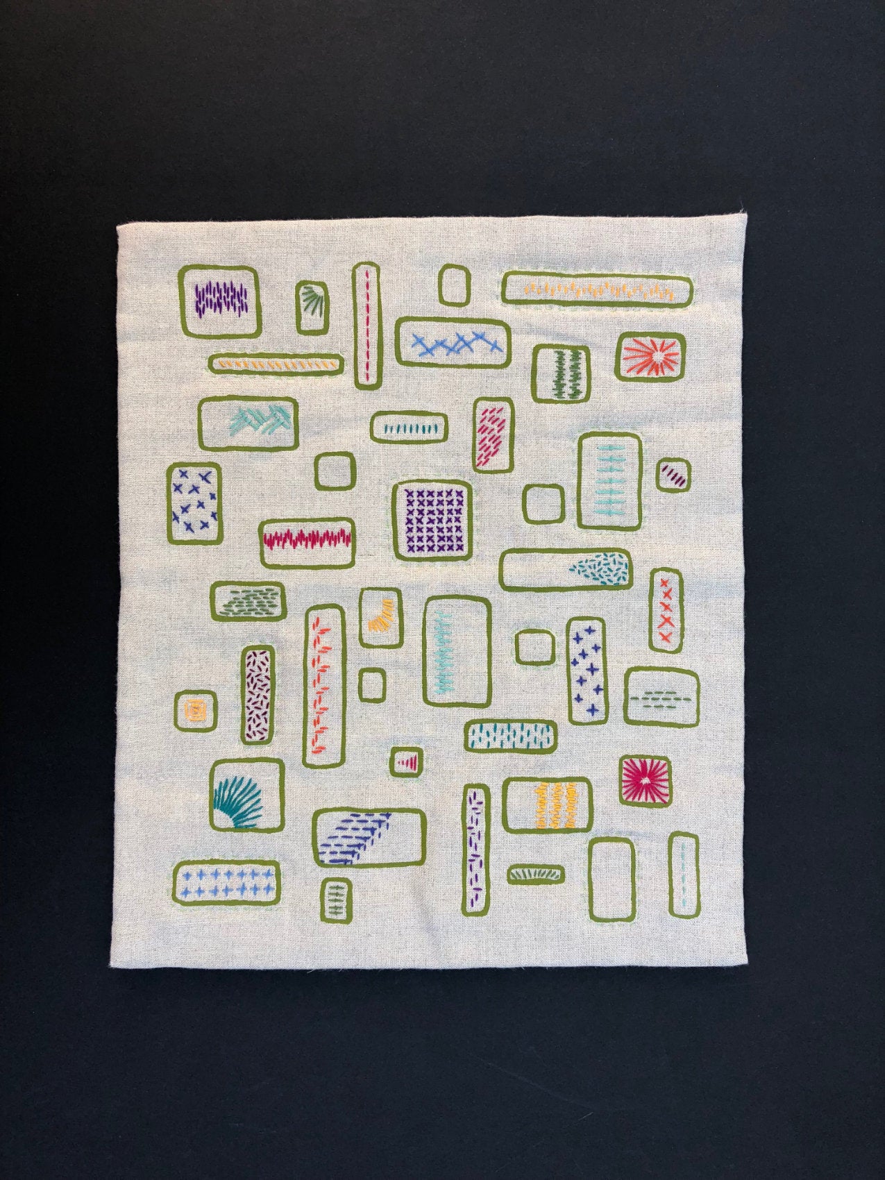 Retro inspired, the design 'windows' is one of my most popular amongst embroiderers, scroll through the images to see a sample I stitched into and went on to make it into a 'modern sampler' and a book cover embroidered by my Mum.