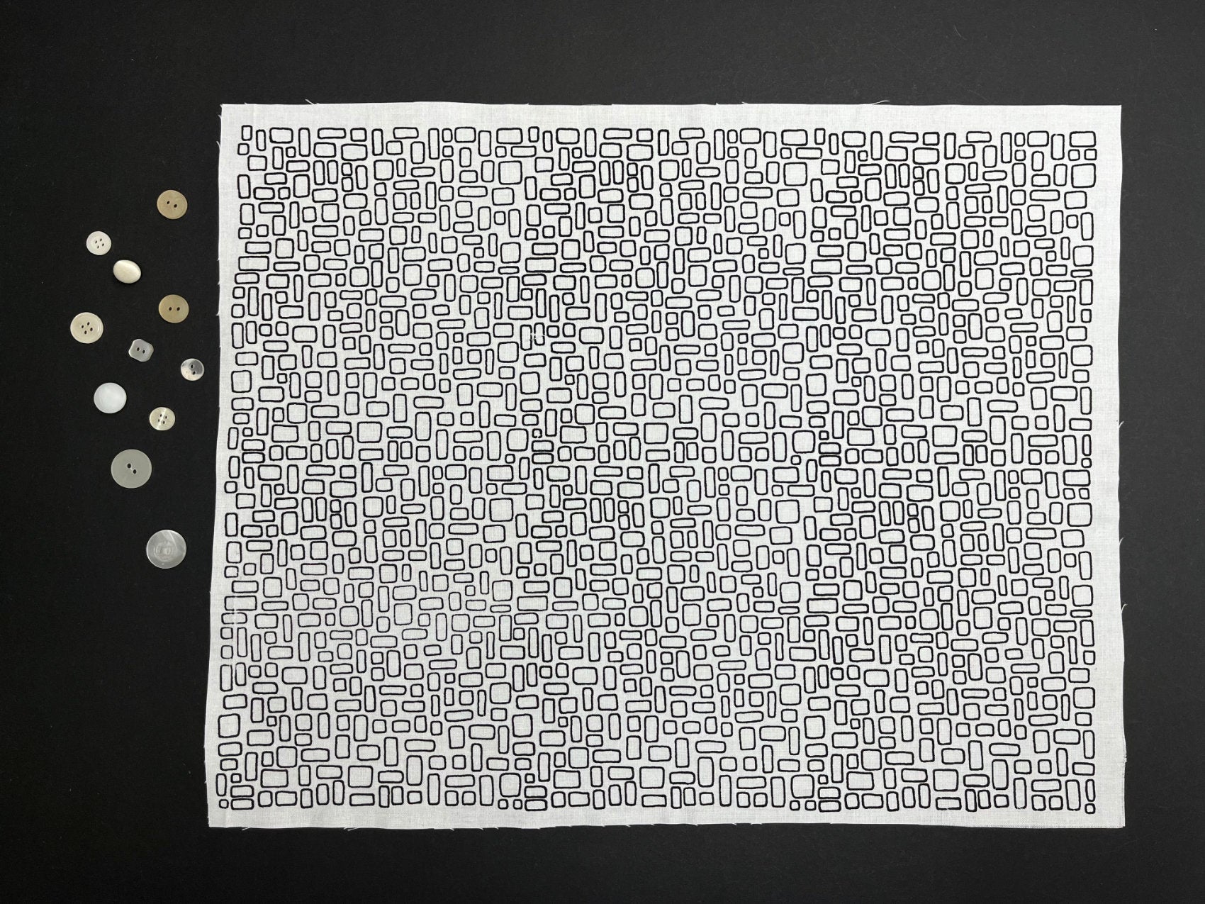 I've used embroidery thread and 'coloured in' the squares and rectangles on the cotton fabric (printed in cloud grey) which you can see in the embroidery hoop. The black would look great filled with shades of grey with some pops of an accent colour.
