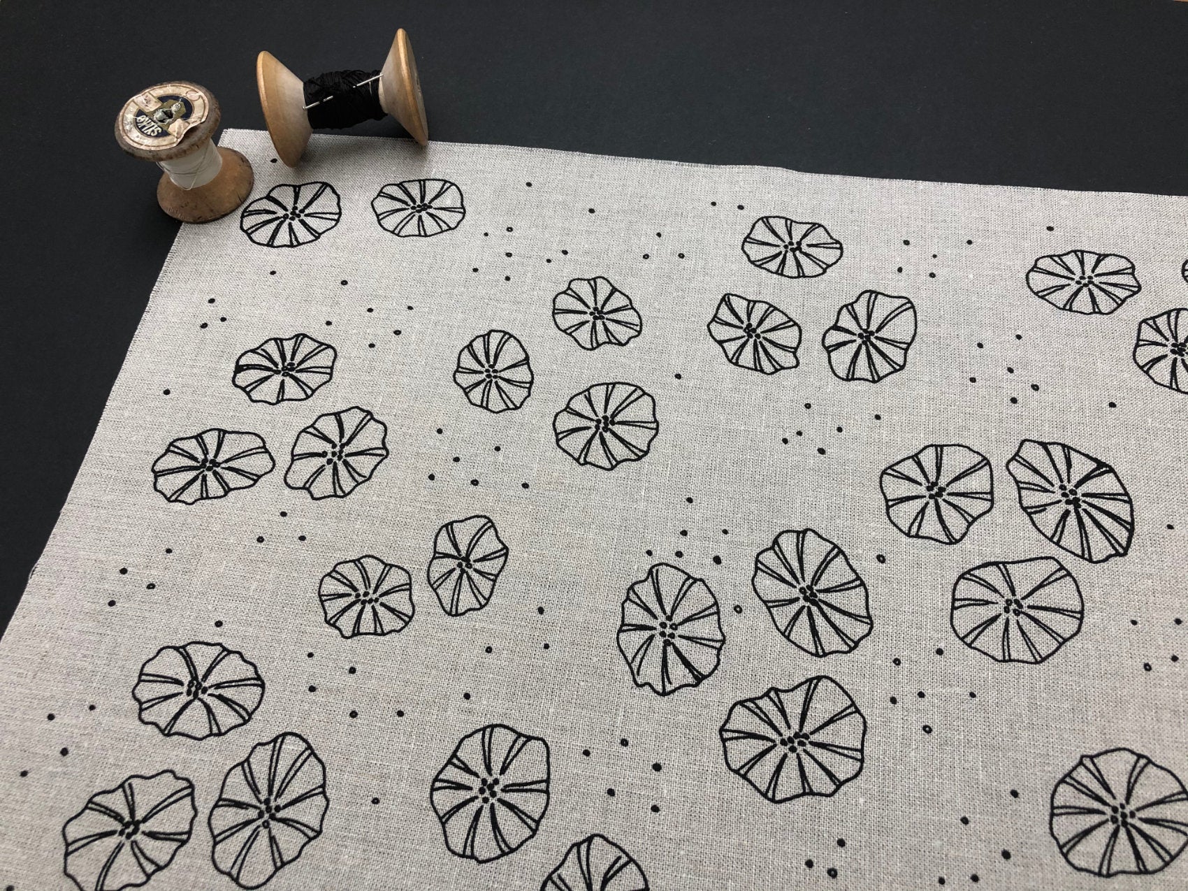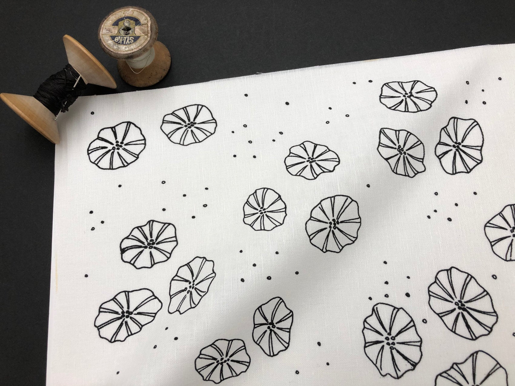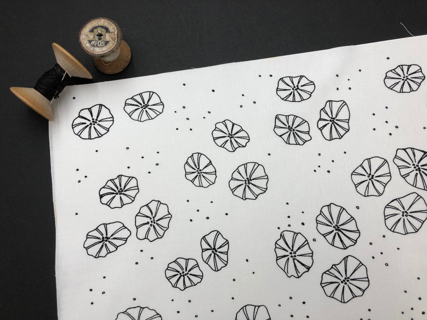 Some of the images show a panel in blush pink that I added some embroidery to, I then used half the panel to make up a drawstring bag. I used a simple seed stitch in a fine embroidery thread, the flowers bloom beautifully with a little colour. Choose your favourite colours and you have an easy project to work on in the evenings. There's a free tutorial to make the drawstring bag here. This black version would look really moody with different tones of grey embroidery thread for the flowers.