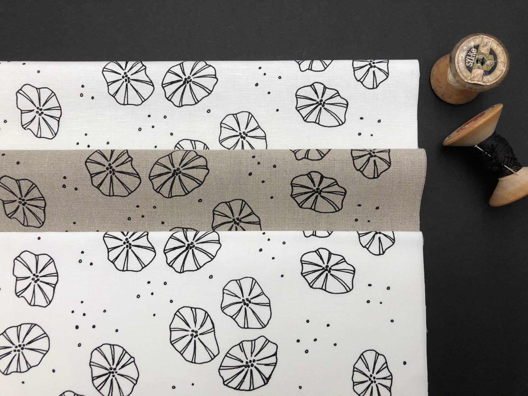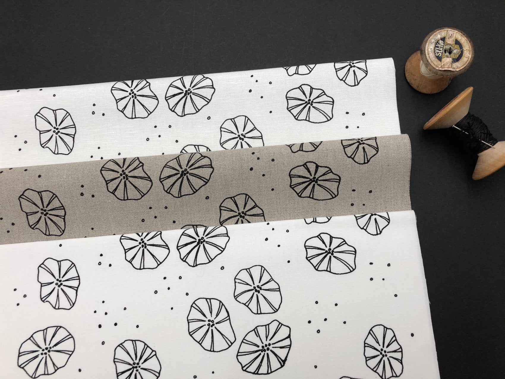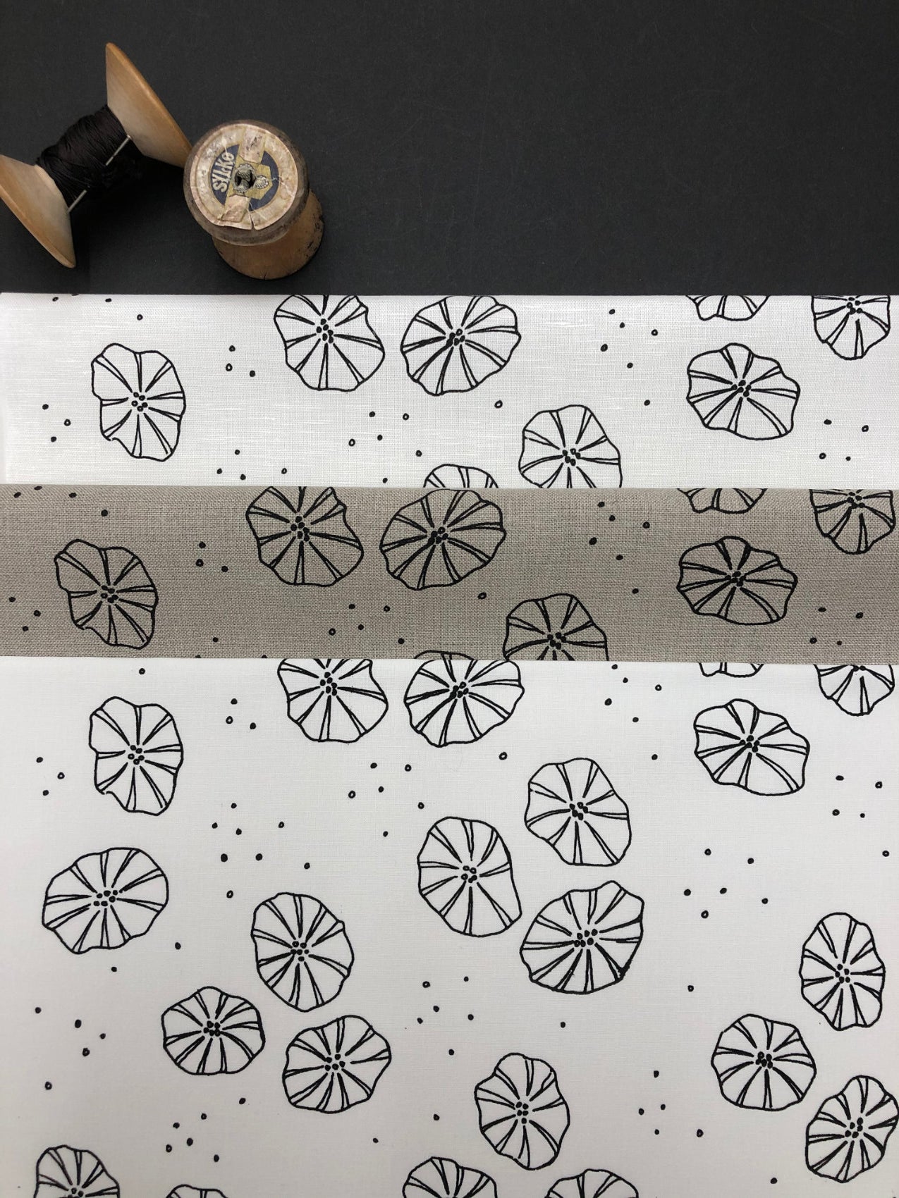 Some of the images show a panel in blush pink that I added some embroidery to, I then used half the panel to make up a drawstring bag. I used a simple seed stitch in a fine embroidery thread, the flowers bloom beautifully with a little colour. Choose your favourite colours and you have an easy project to work on in the evenings. There's a free tutorial to make the drawstring bag here. This black version would look really moody with different tones of grey embroidery thread for the flowers.