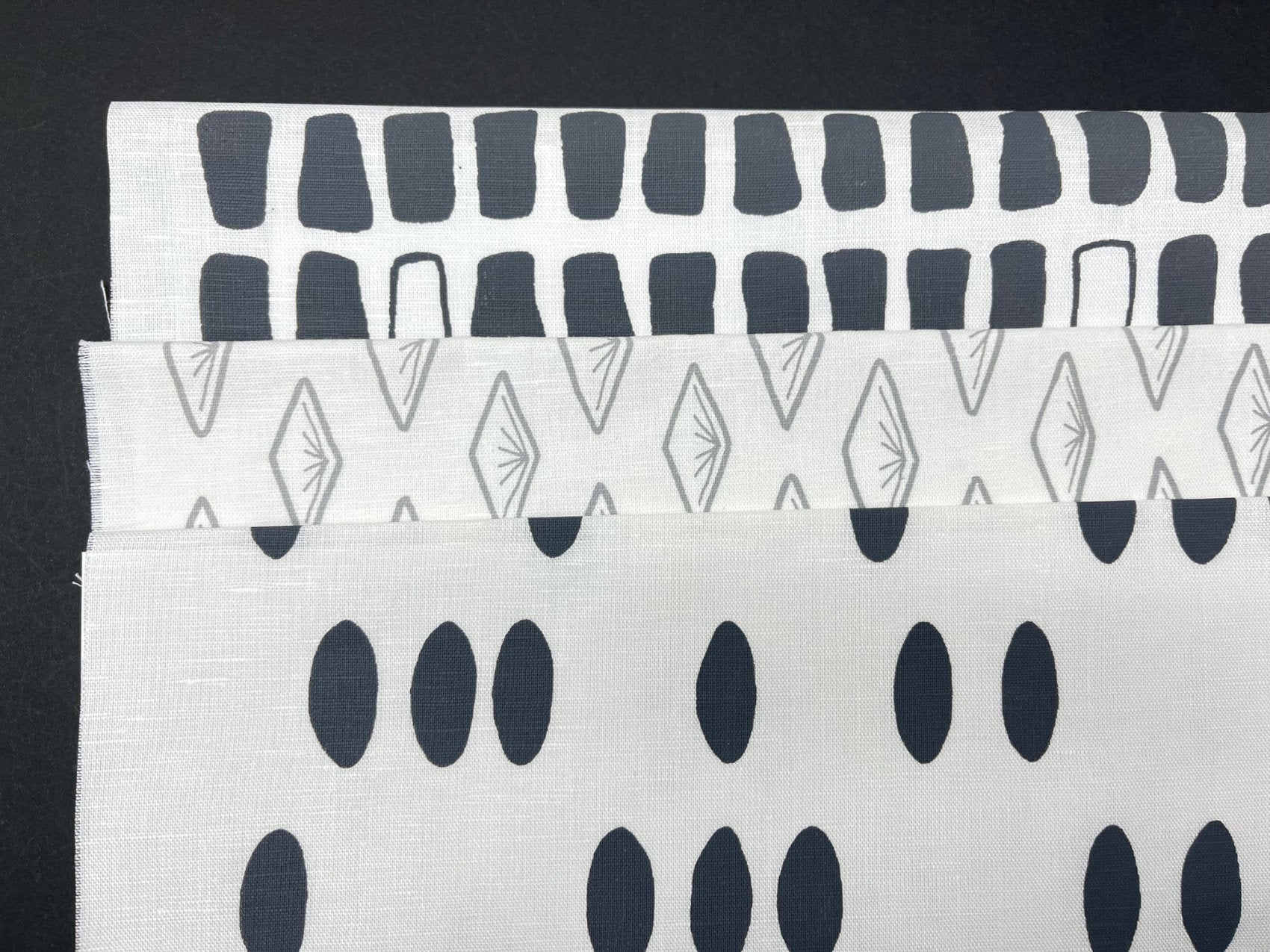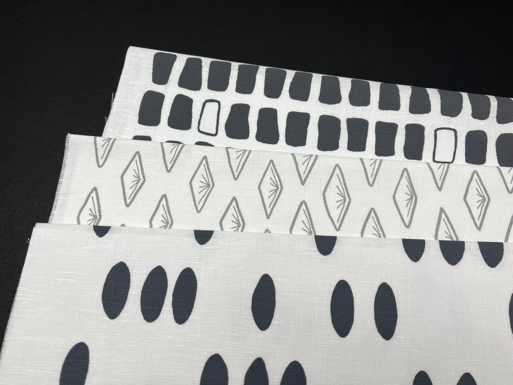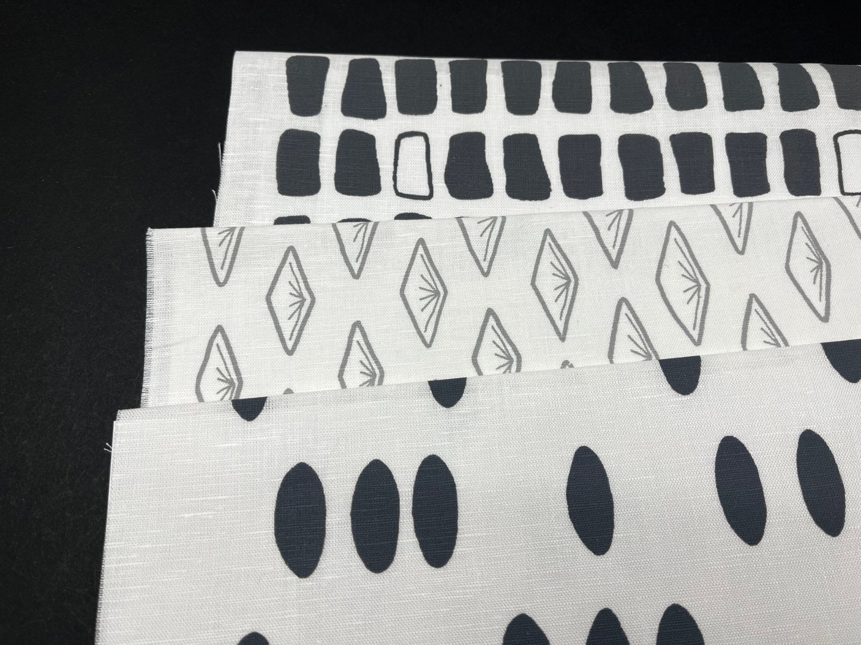 Printed in Stone Grey and Cloud Grey, all printed on white linen cotton blend fabric, 54% linen / 46% cotton.