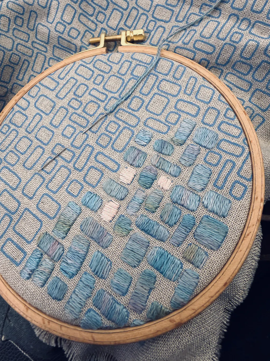 I've used embroidery thread and 'coloured in' the squares and rectangles on the cotton fabric which you can see in the embroidery hoop, in this example I've stitched onto the cloud grey printed fabric.