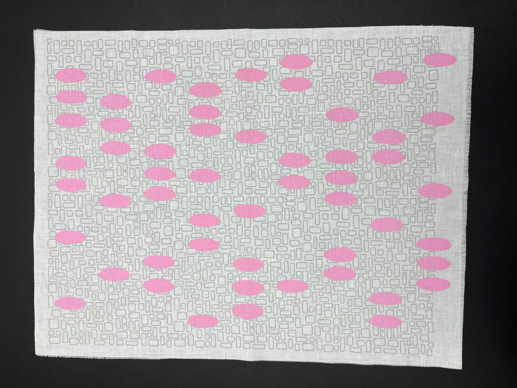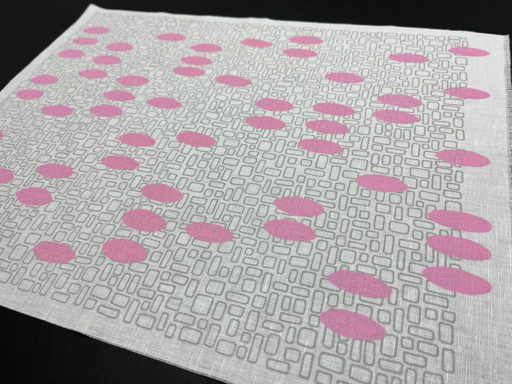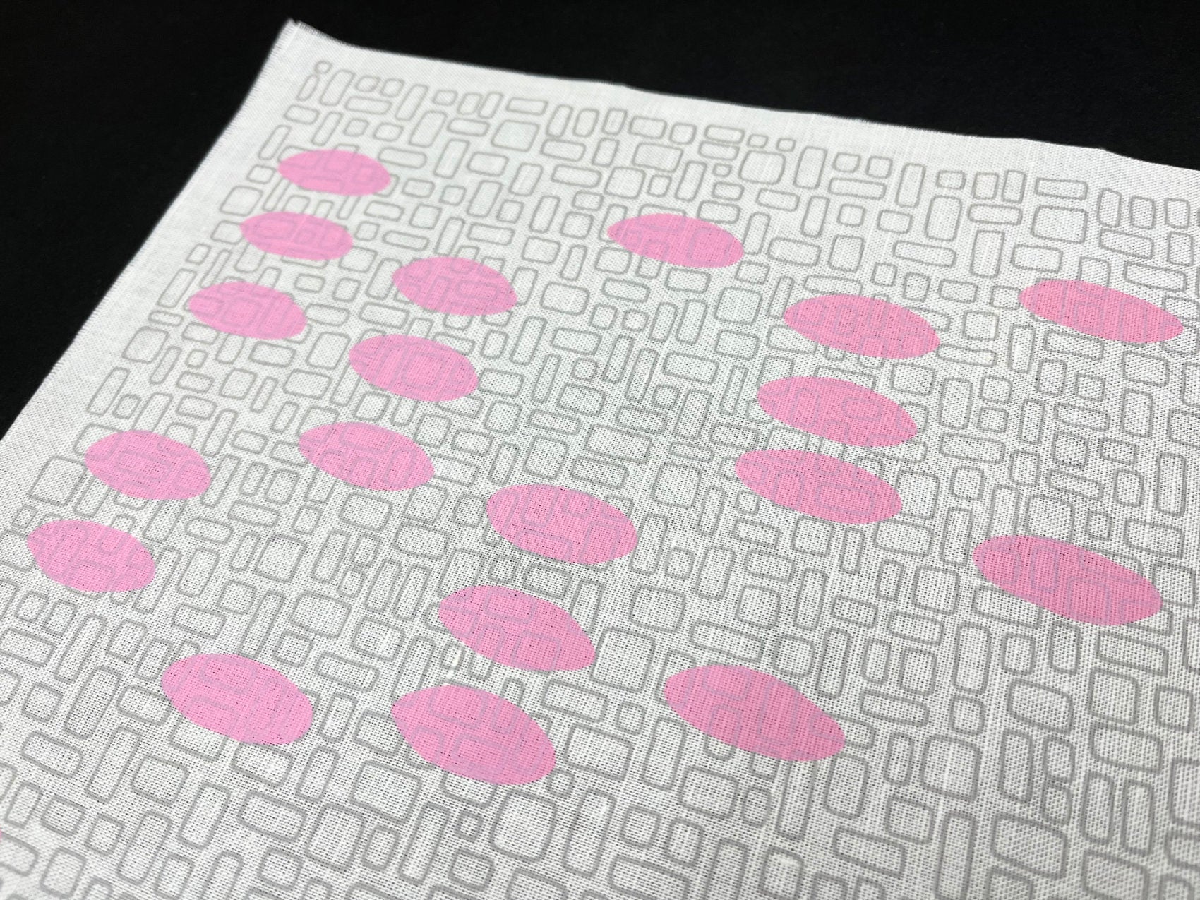 Mesh is printed in cloud grey and over printed with the design Pebble in blossom pink to create and original fabric for you to incorporate into your projects. This is a Limited Edition Double Print, so get one while they are available.