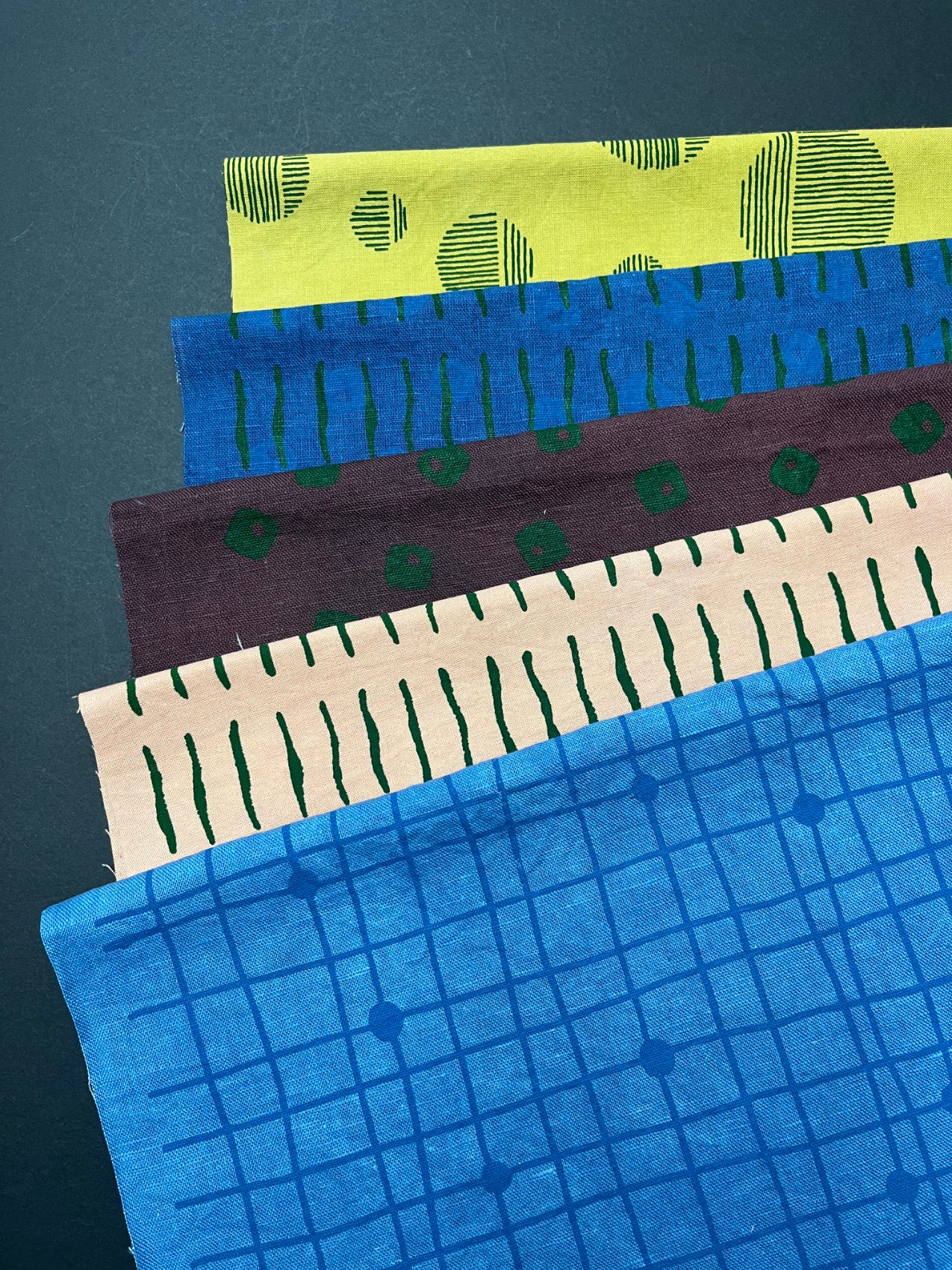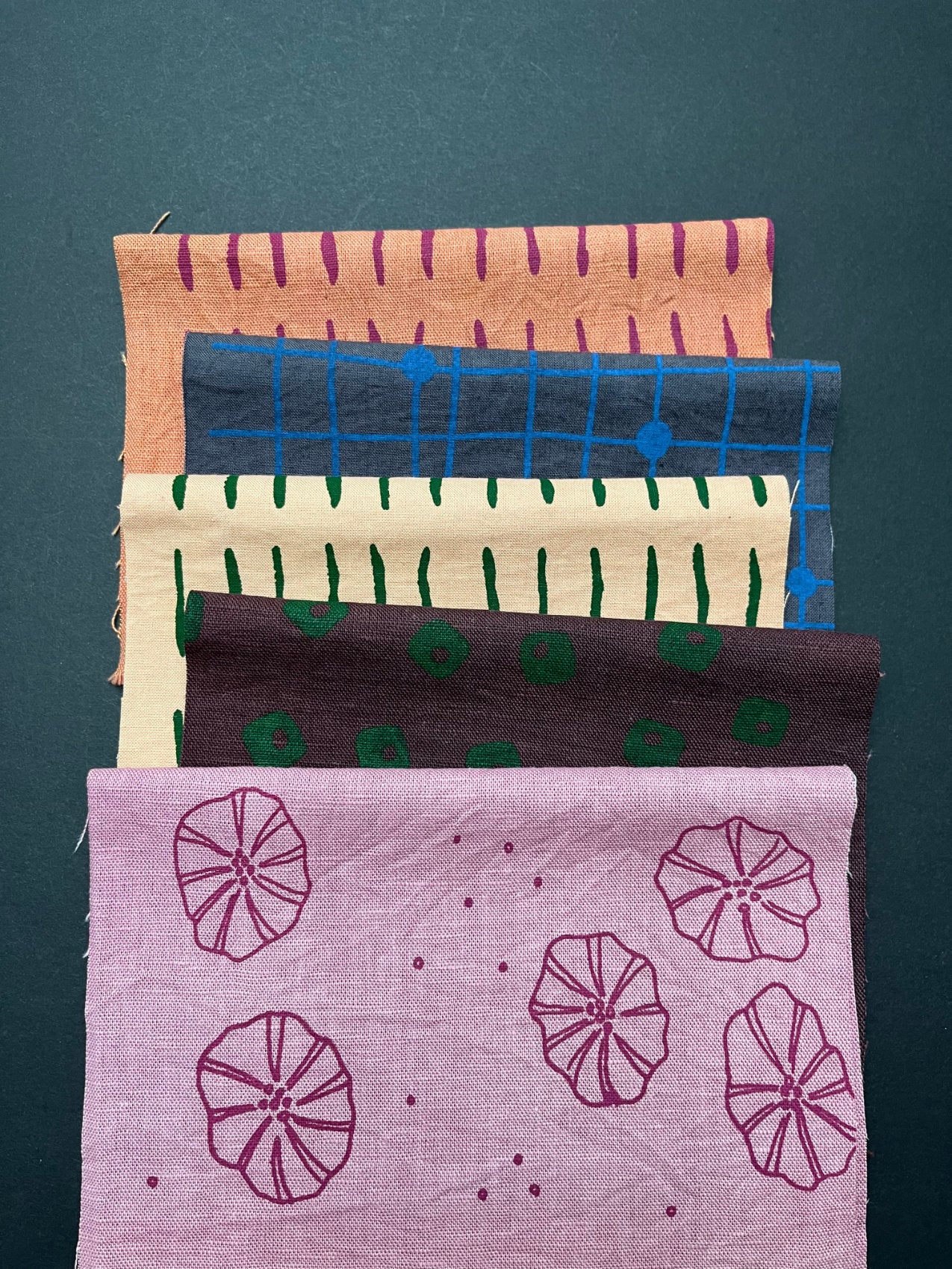 These Limited Edition Fabric Packs are a collaboration between myself and Natural Dyer Elli Beaven of Wholecloth Studio, Elli has dyed the cotton and linen / cotton blend fabrics I usually print on with plant dyes to produce these wonderful deep and luminous shades. I have then printed over the top to create some truly unique and limited edition fabrics.