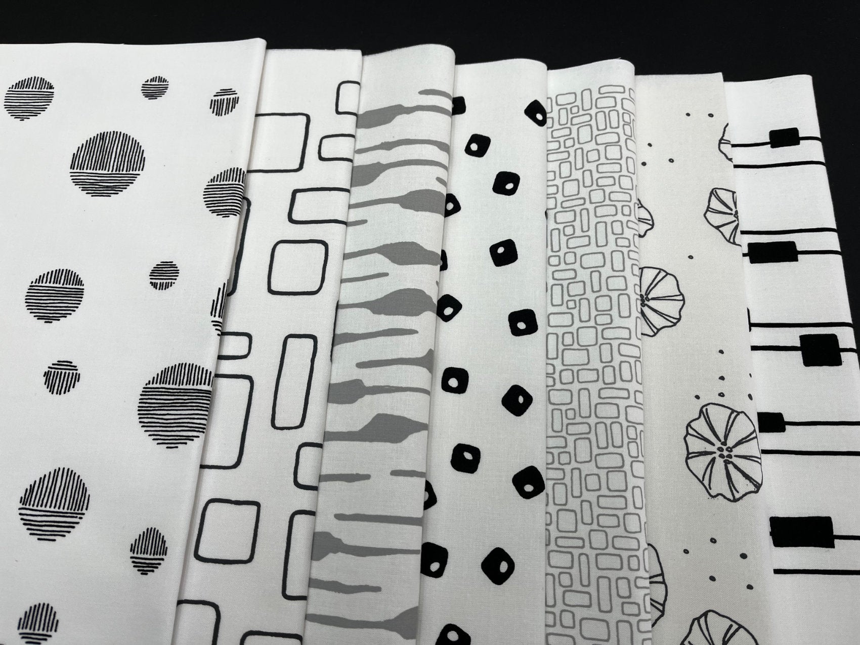Bundle of seven cotton panels selected for the Pod Quilt Tutorial in black and greys. Black, Stone grey and Cloud grey. This is enough printed fabric fabric for the 20 pods shown in the tutorial. Normally £11.50 per panel, (£80.50 for 7 panels) this bundle is available at special rate. Available while stocks last.