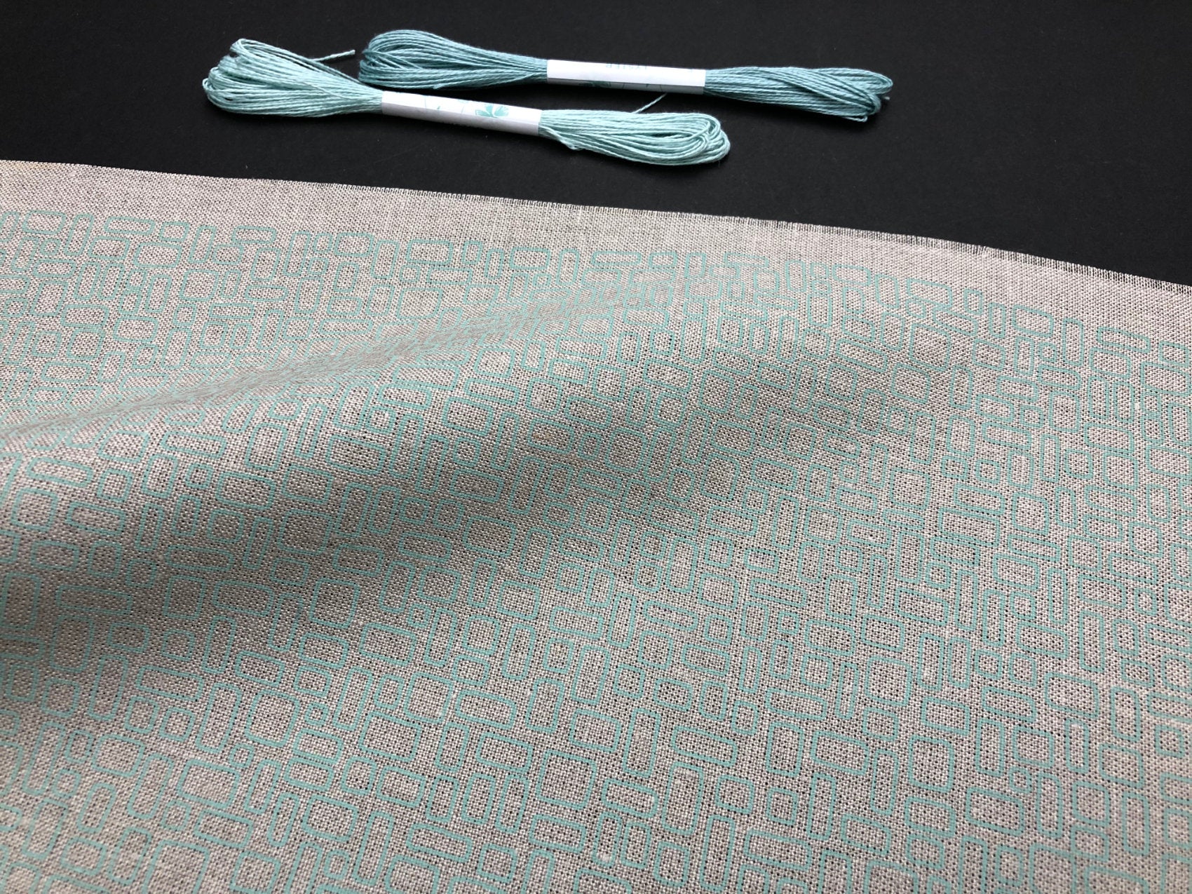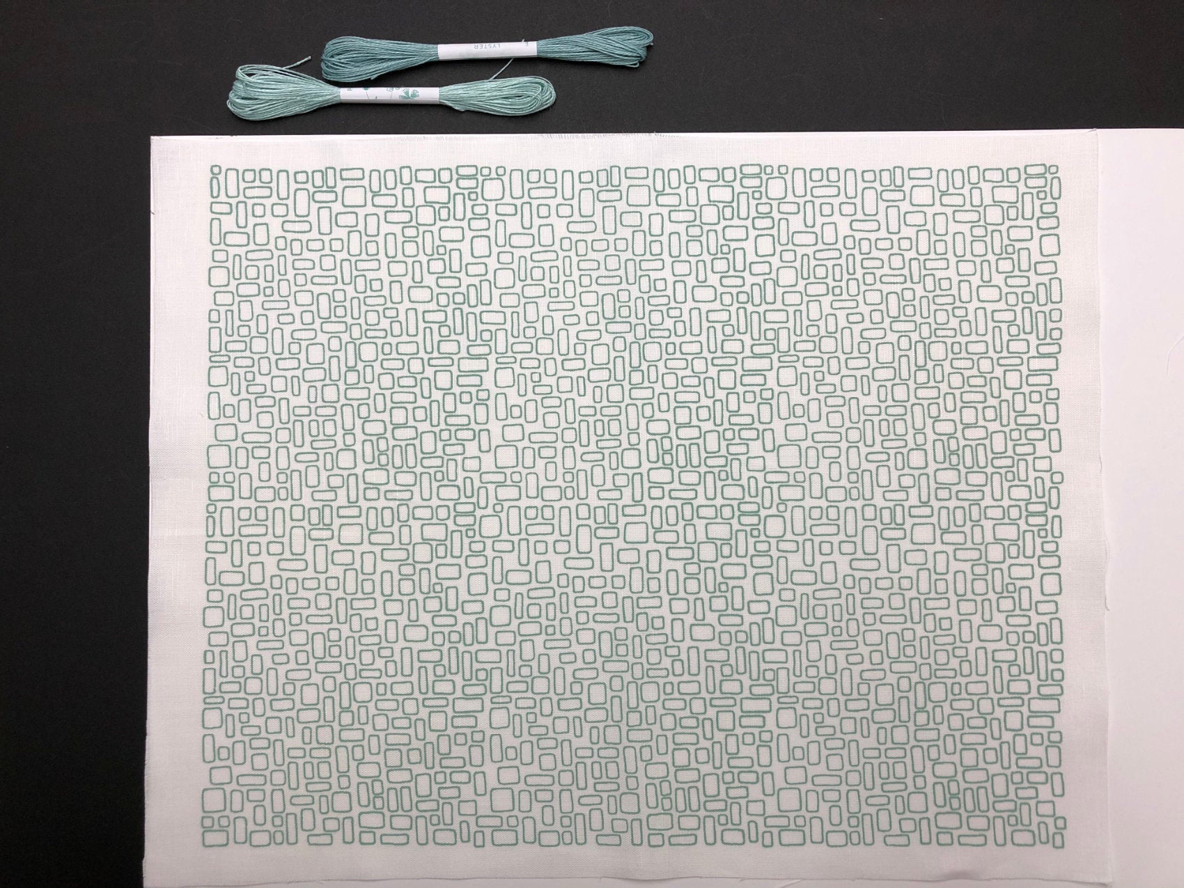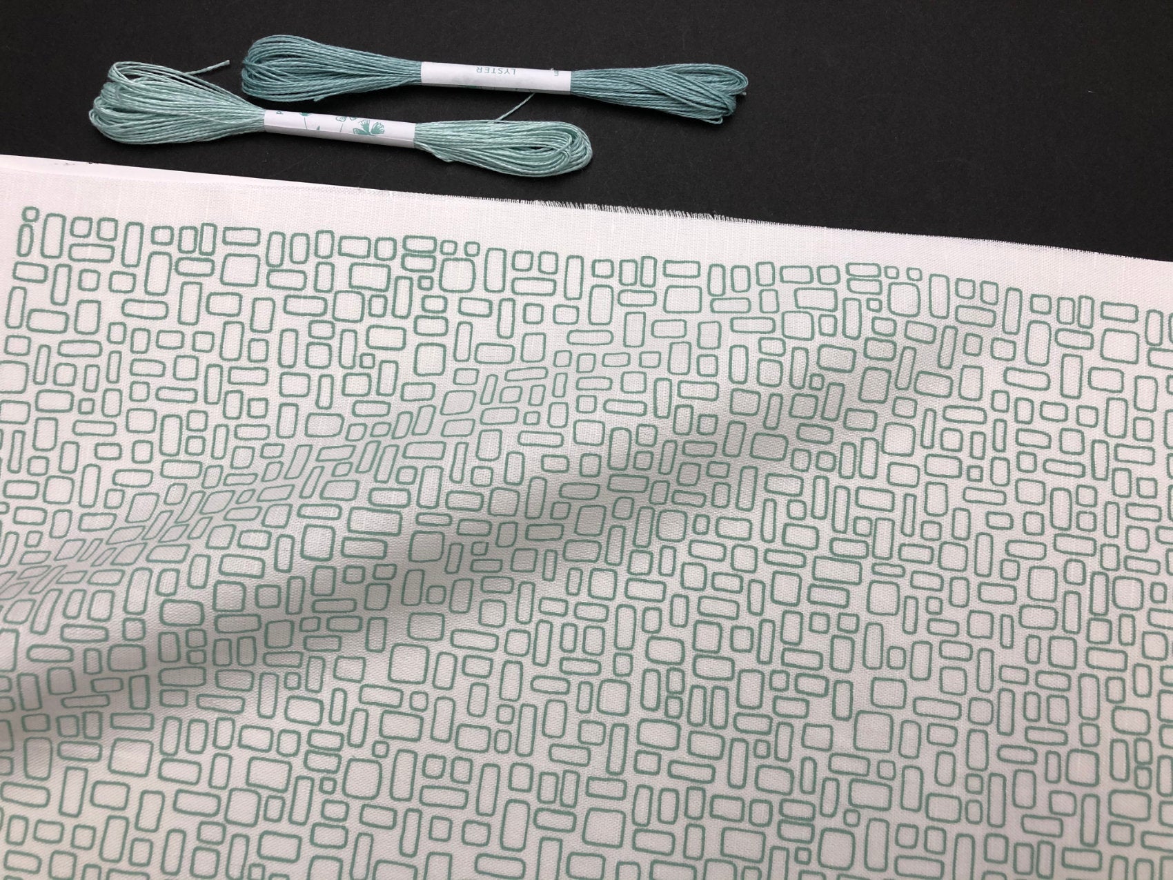 'Mesh' design hand screen printed onto fabric. For a simple embroidery project add some colour by filling in the squares with satin stitch, a mindful project to soothe the soul.