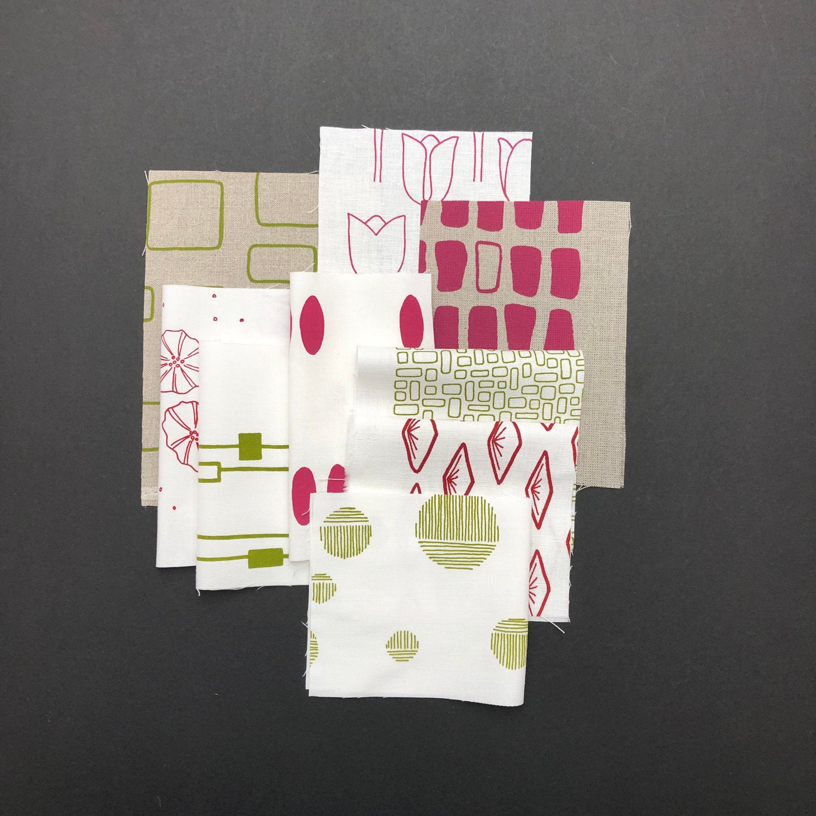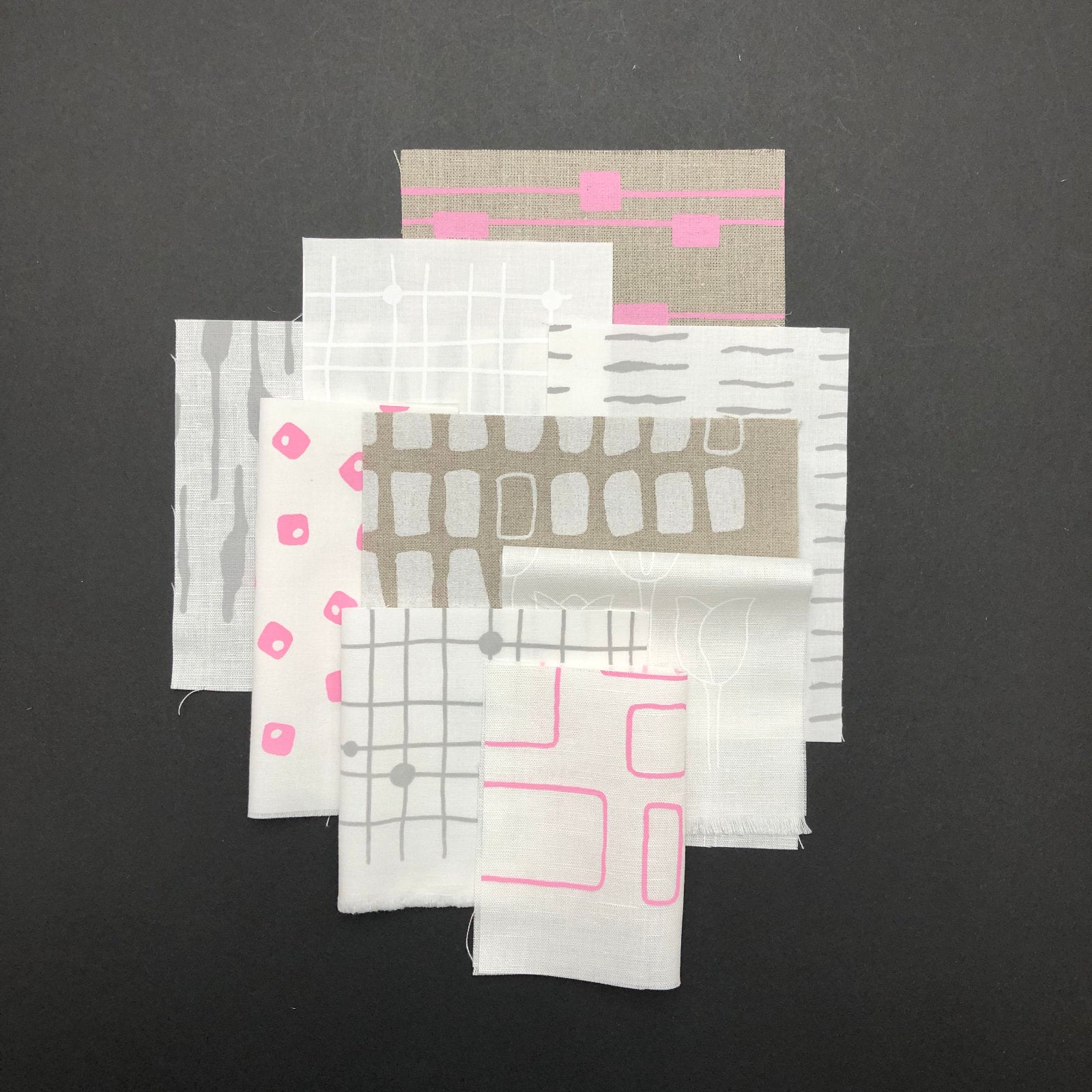 Sample packs of my hand screen printed fabrics, the perfect way to try out these designs and base cloths. Ideal for patchwork and small craft projects.